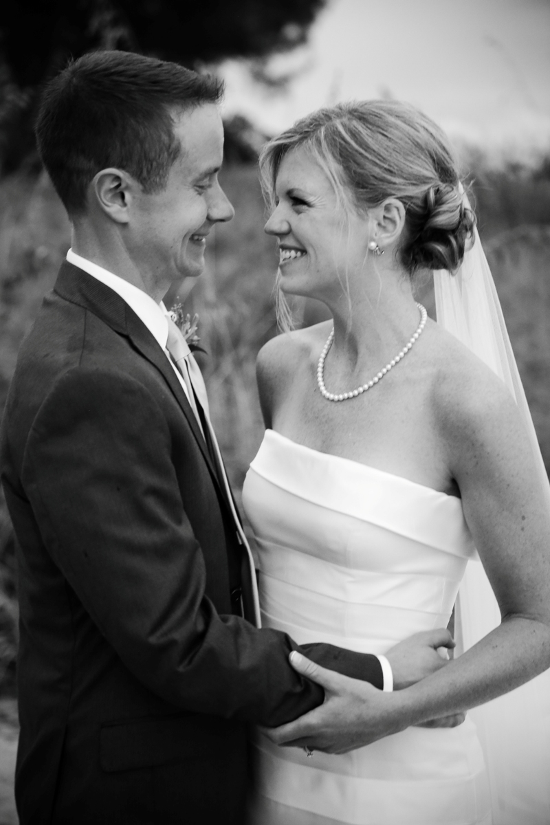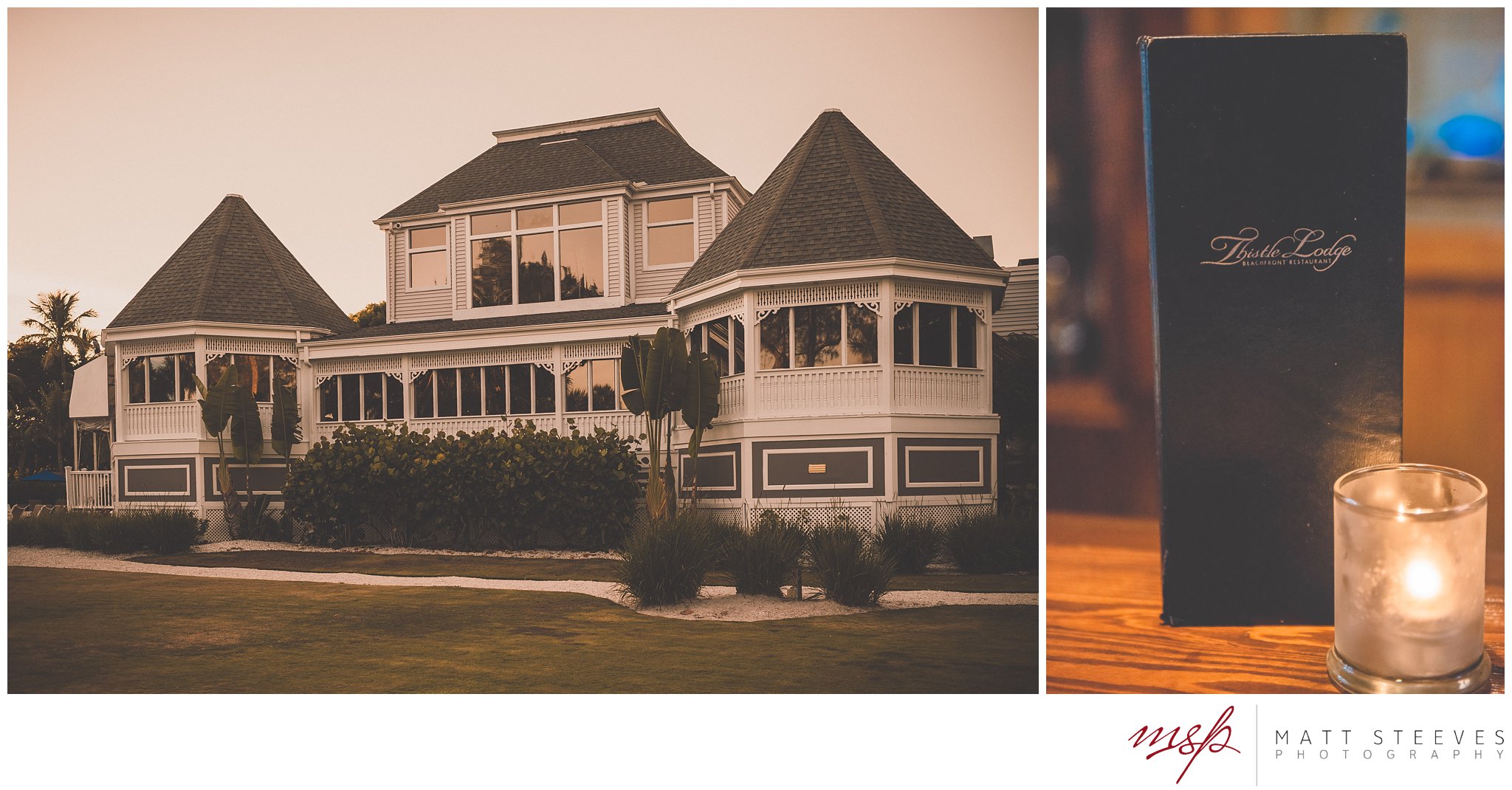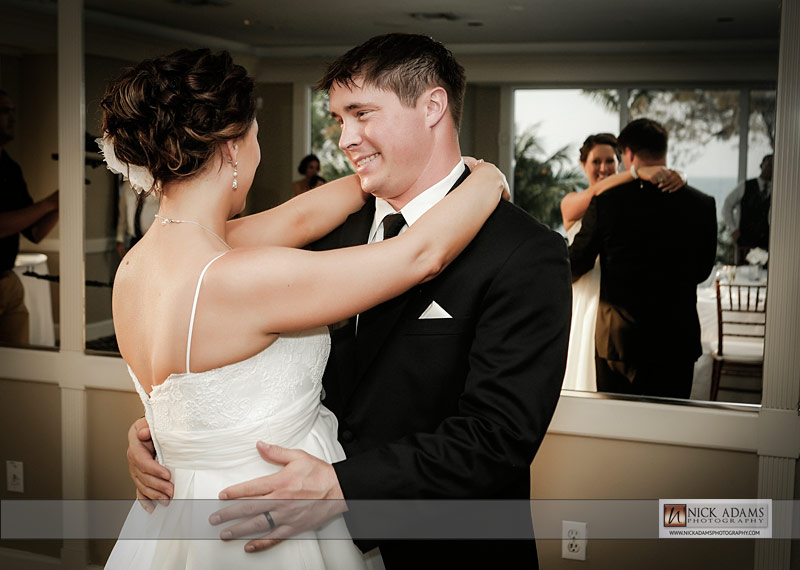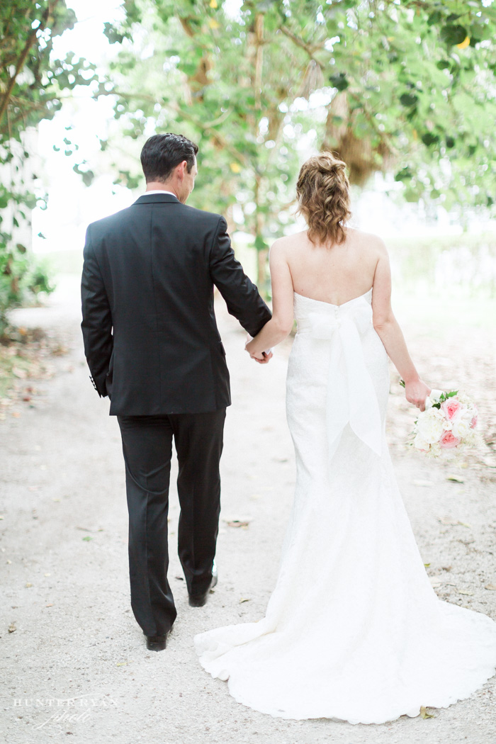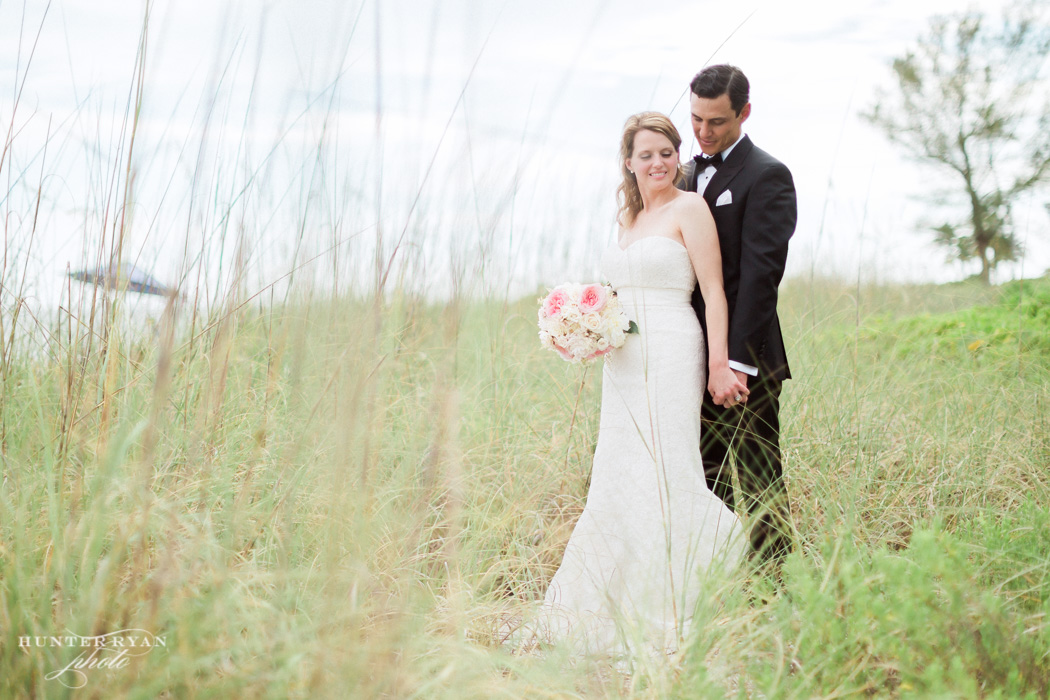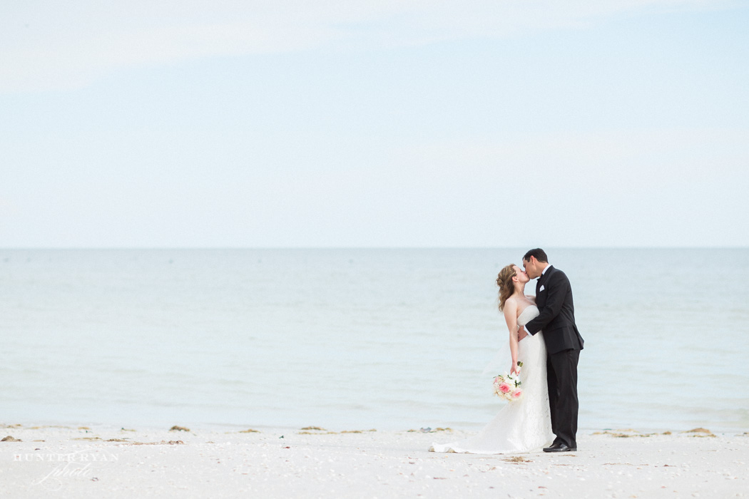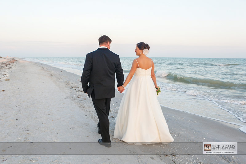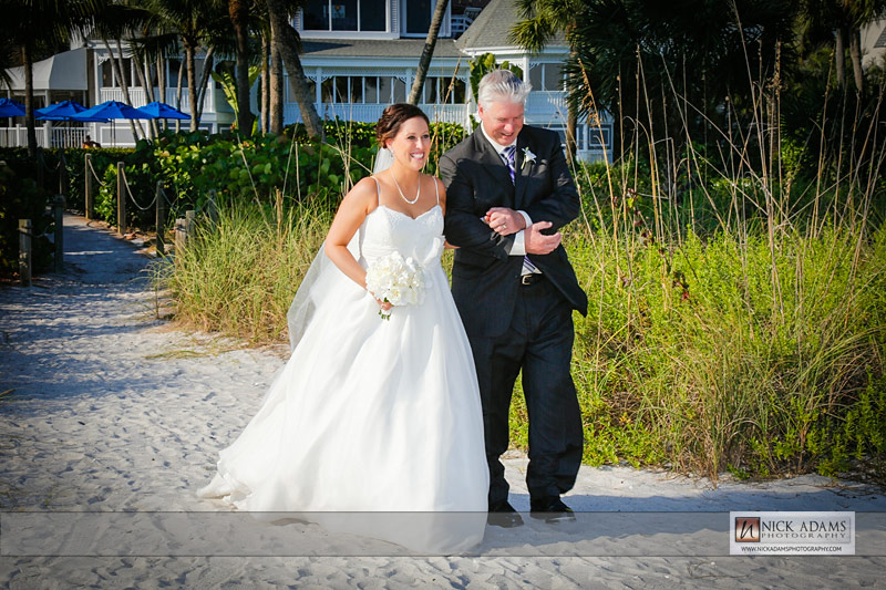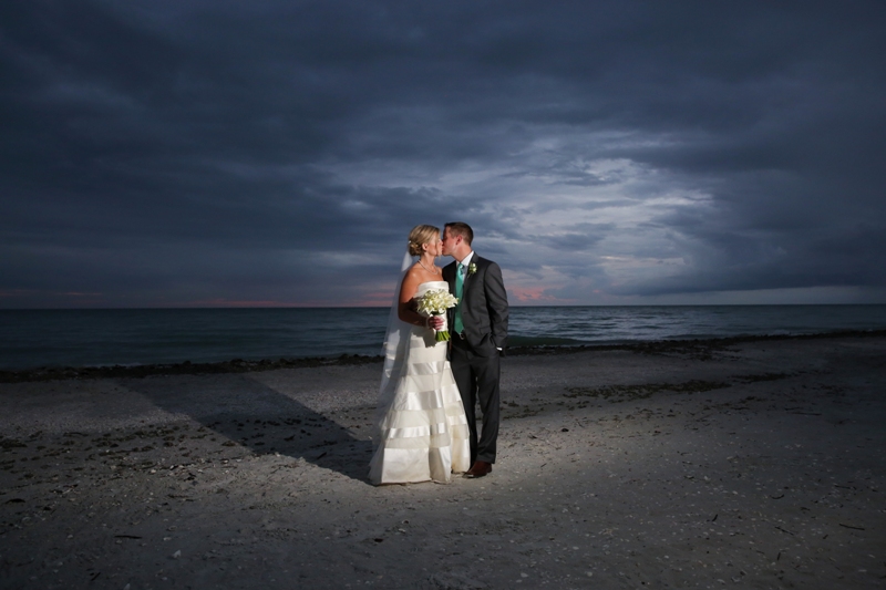 After Kyle and Courtney’s Casa Ybel Resort wedding ceremony, the guests walked to the tented lawn. They enjoyed cocktails and music while we continued photographing the families and bridal party. When we finished the group photographs, we had some time for the bride and groom to walk the beach. Courtney’s gown looked great as the wind picked up the train while they walked along the Casa Ybel Resort Beach. The cool evening breeze flowed through this tent wedding with music, candlelight and dinner throughout the wedding. Later in the evening, the party continued in the Waterfront Room, upstairs at the Thistle Lodge Restaurant. Shown here are some of my favorite photographs that we created at this Casa Ybel Resort Wedding. This Sanibel Island resort is well-known for destination weddings.
